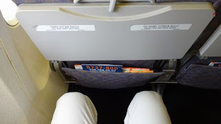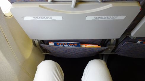 ▲シートピッチも狭く、膝周りのスペースに余裕がありません。成田からインチョンまでは2時間強で十分許容範囲ではありますが、スペースが広いに越したことはありません。