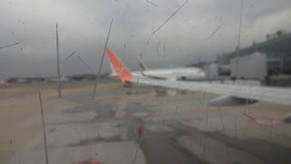 ▲窓には多数の大きな傷が……。こんなところにも古さが出ていますね。フライトの安全性には直接の問題はないのでしょうが、やはりこういうのを見てしまうと気分が沈んでしまいます。