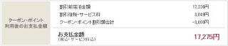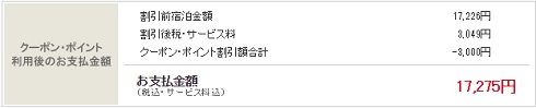 ▼税込みのトータル料金は20,000円を超えるので、3,000円割引クーポンが適用されます。適用後の支払額はなんと、17,275円に!エクスペディア8%割引価格よりもさらに1,622円お得になりました!これなら、じゃらんを使わない手はないでしょう!
