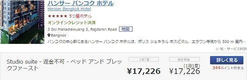 ▼たとえば、バンコクの人気ホテル「ハンサーバンコク」で比べてみましょう。とある日の1泊の料金はエクスペディアでは17,226円と表示されます。