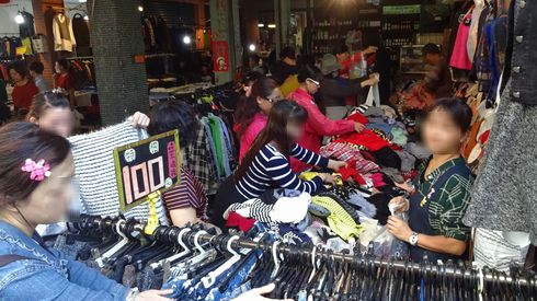▲こちらの衣料品店では、常時ワゴンセールが開催されています。みんなワゴンに群がって買いあさっています。凄まじいエネルギー!