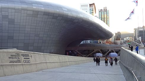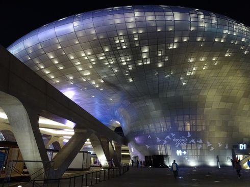 ▲こちらが東大門デザインプラザ。屋根と言っていいのか、ひさしと言っていいのか、とにかくよくわからないウネッとした巨大な頭上にせり出してきています。
