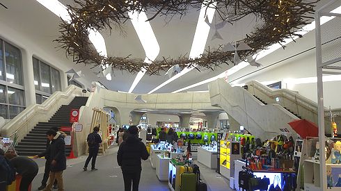 ▲中には、ショップや博物館、イベントスペースなどが入っています。外観に比べると内装は落ち着いているものの、それでもやはりザハ特有の曲線を見ることができます。というか、直線や角がほとんどなく、柱や壁は全て曲がったり歪んだりしていました。