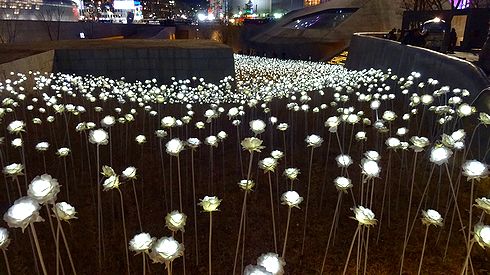 ▲建物の中にいたら悪酔いしそうなので、外に出てみました。日が沈み、あたりは夕闇に包まれています。デザインプラザの脇には広場があり、何千本もの光るバラのインスタレーションが設置されていました。なかなか幻想的で綺麗ですね。