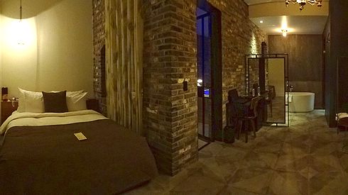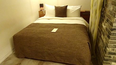 ▲キングサイズのベッド。広々としていて、ぐっすり眠れますね。室内が、石レンガのテイストでまとめられていて、落ち着きます。