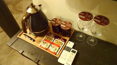 ▲マグカップが2つ、ワイングラスが2つ、そしてティーバッグやコーヒーが3種類。なかなか充実していますね。