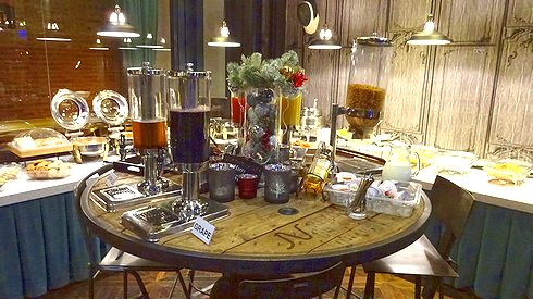 ▲朝食はビュッフェになっています。ジュースサーバーなどの配置にも、センスを感じます。なんかオシャレ。