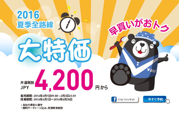 台湾のLCC、Vエアがセールを行います。なんと、全路線が対象で、4,200円から。