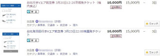 「流石に海外の航空券は転売されてないよね、パスポートで名前わかっちゃうしね」などと適当に検索してみたら、なんと台北行きのVエアのチケットがオークションに出されていました。