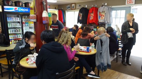 ▲店内は、かなり混雑していました。もともとが卸問屋だったこともあってか、一般客向けのイートインスペースがかなり狭い上、名物のロブスターロールを食べに来ているお客さんで賑わっていました。