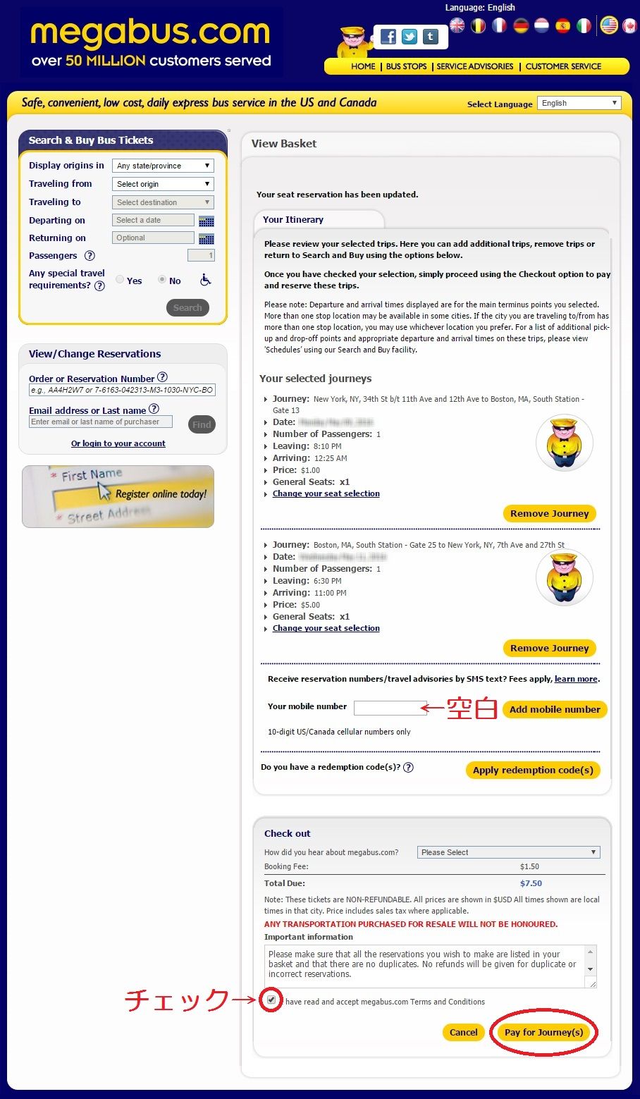 ▼選択した便の確認画面に遷移します。日時などが間違っていないか確認しましょう。その下には電話番号の入力欄がありますが、これはアメリカとカナダのみですので空白のままで結構です。一番下の”I have read and accept megabus.com Terms and Conditions”にチェックを入れ、【Pay for Jaorney(s)】をクリック。