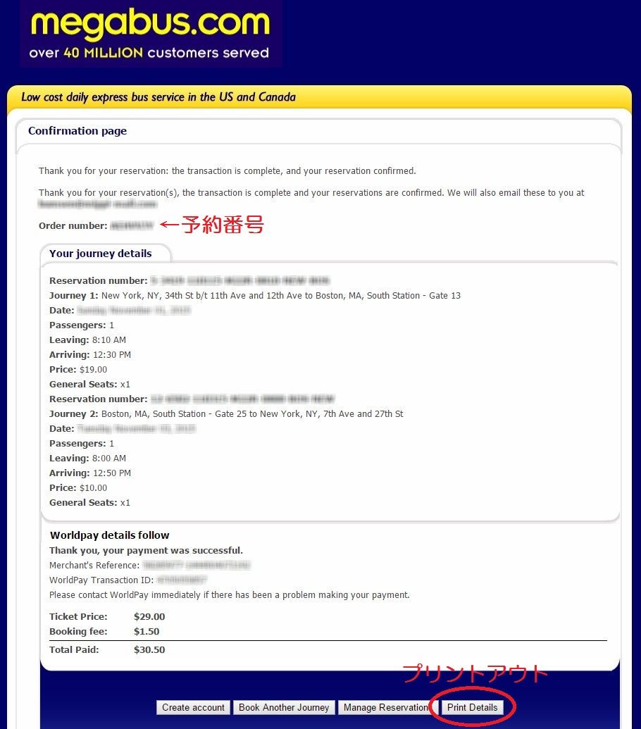 ▼支払いが完了すると以下の様な画面が表示されます。予約番号が表示されますので、必ずメモっておきましょう。また、一番下にはプリントアウトのボタンもありますので、プリントアウトしておいたほうが良いでしょう。