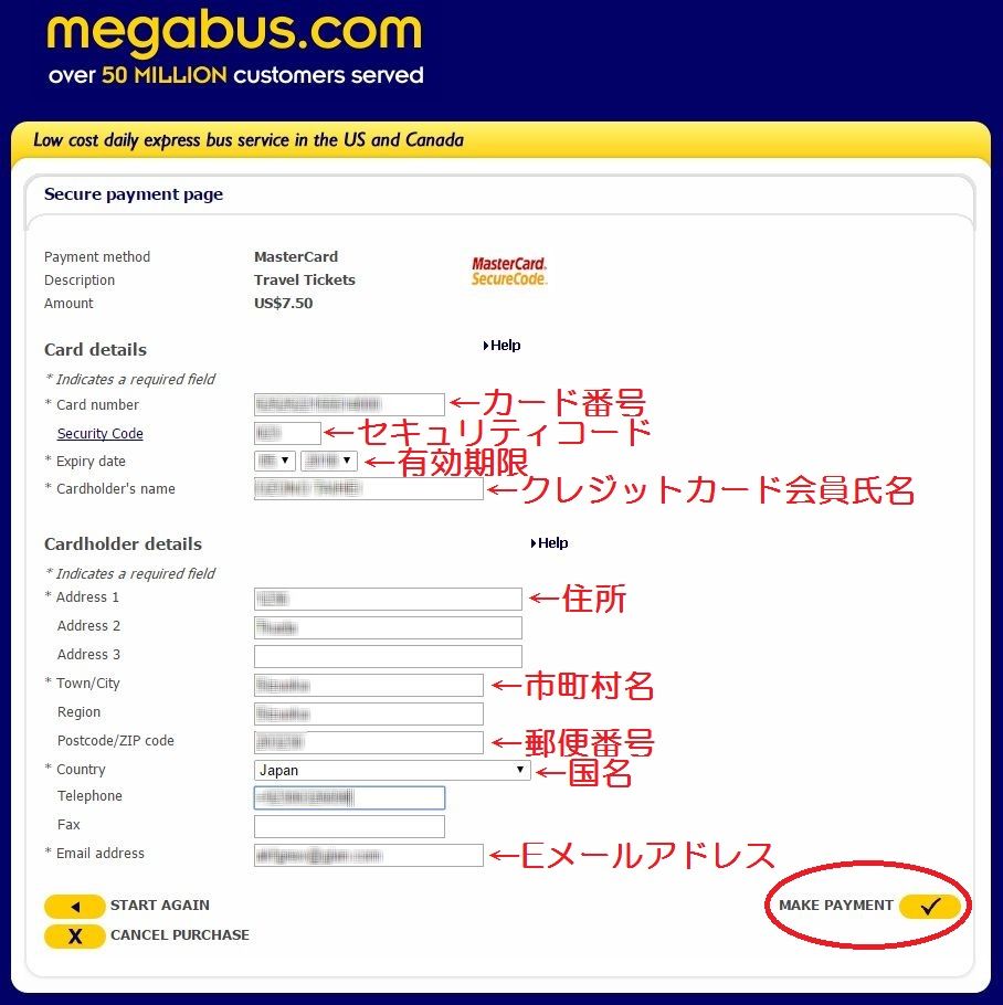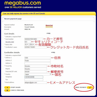 ▼クレジットカードの必要事項と、請求先の住所、そしてメールアドレスを入力し、【MAKE PAYMENT】をクリックすると、決済が行われます。
