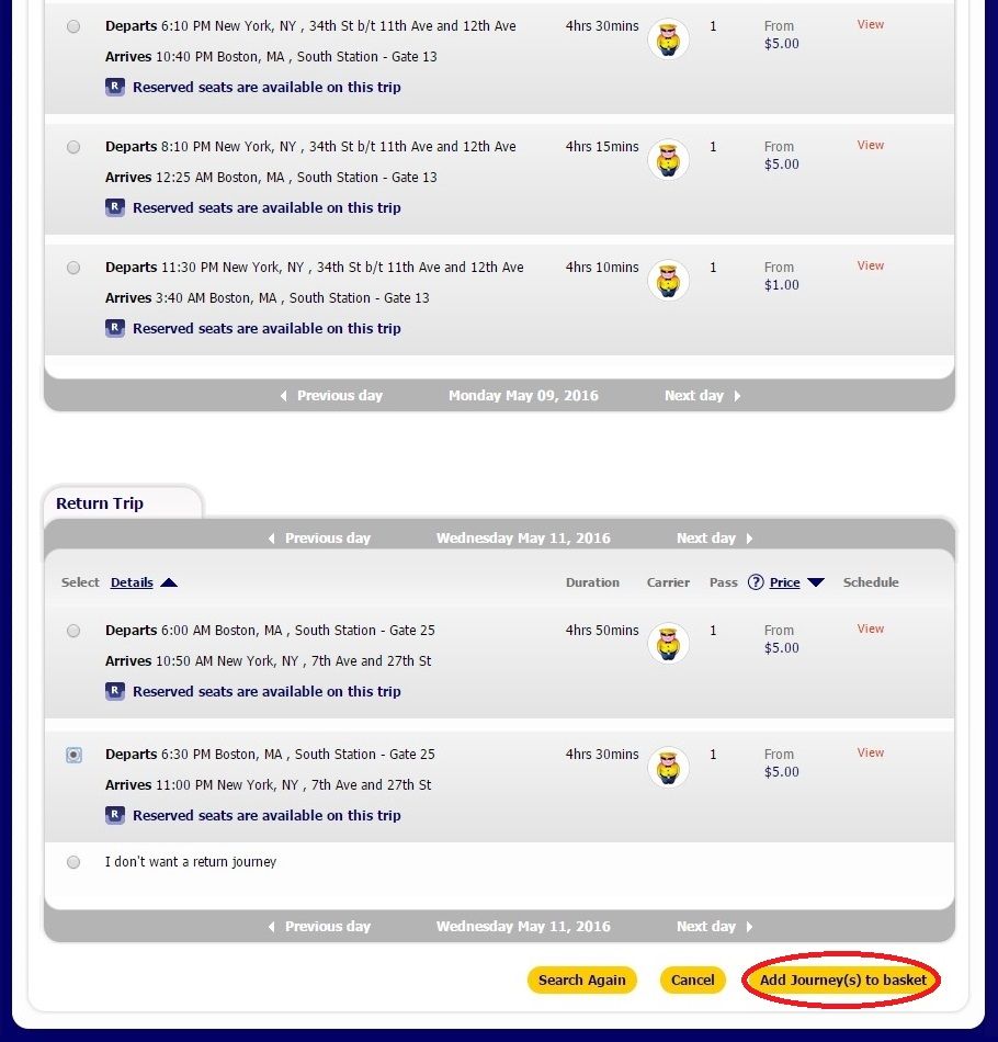 ▼条件に合う便の候補が幾つか出てきますので、時間や料金などを考慮して利用する便を決めましょう。メガバスでは料金が1ドルという格安の便もあります!便を選択し、【Add Journey(s) to basket】をクリックします。