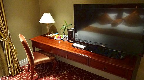 ▲ベッドの正面には、液晶テレビとライディングデスクがありました。