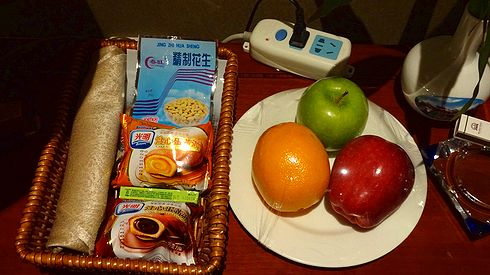 ▲その上には、ウェルカムフルーツとスナック菓子が用意されています。特にフルーツがあるのは嬉しいですね。早速いただきます。