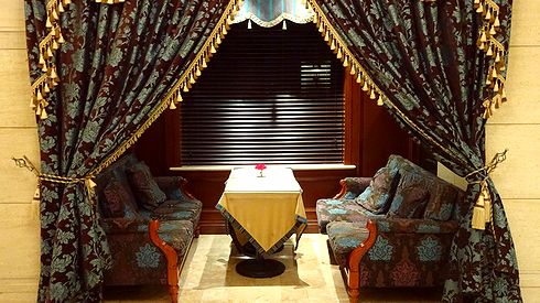 ▲ロビーの一角には、これまた豪華なソファが。カーテンを閉じれば半プライベートな空間としても利用できます。