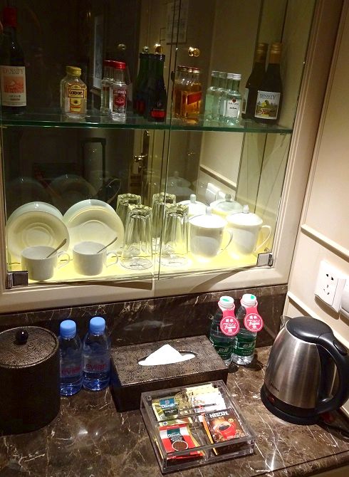 ▲もちろんミニバーもありました。ミネラルウォーターやティーバッグ類、さらにはアルコールも備わっています。