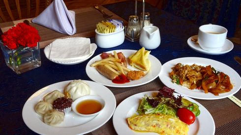 ▲朝食はビュッフェスタイルになっていますが、まずはビュッフェコーナーのインテリアの素晴らしさを堪能しましょう!壁には高価そうな陶器が飾られ、天井からはシャンデリアが吊るされています。こんなに贅を凝らしたレストランは生まれて初めてです。料理は中華からコンチネンタルブレックファーストまでそろっていて、かなり豊富でした。