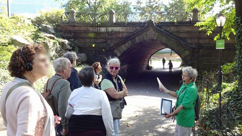 ▲ツアーが始まりました。ベルヴェデーレ城周辺のスポットを歩いて巡り、所々でニューヨークやセントラルパークの歴史について解説してくれます。そもそもセントラルパークは、ニューヨークの環境悪化への対応策として、人の手で木が植えられ作られたのだそうです。今のセントラルパークからは、そんなことは全く感じられません。