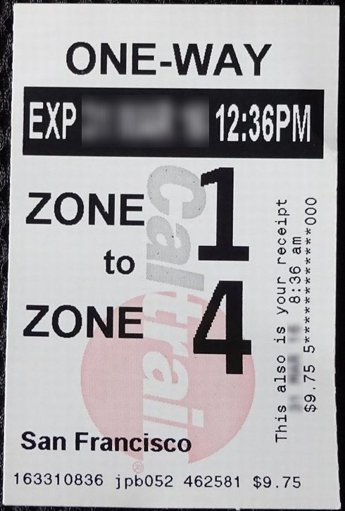 ▲まずはチケットを購入します。カルトレインの料金はゾーン制になっており、サンフランシスコ駅からサンノゼ空港の最寄り駅であるサンタクララ駅までは4ゾーンで、片道9.75ドルです(⇒料金表)。自動販売機で乗車するゾーンの数を選択し、支払い(クレカも可)を済ませれば、上のようなチケットが発券されます。チケットの有効期間は4時間で、乗車中に検札がありますので無くさないようにしましょう。