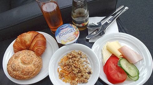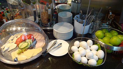 ▲ハムやチーズ、スライスされたトマトやキュウリに、ゆで卵、リンゴ。ドイツのコンチネンタルブレックファーストにはおなじみのものが揃えられています。