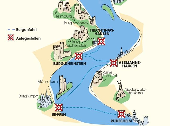 ▲リューデスハイムからのクルーズ船は、ビンゲン、アスマンスハウゼン、ラインシュタイン城、トレヒティングススハウゼンを5箇所を、40分~1時間程度で結んでいます。もちろん途中下船も可能で、例えば上記の渡し船と同様に、リューデスハイム⇔ビンゲン間を渡し船の代わりに使うことも可能です。