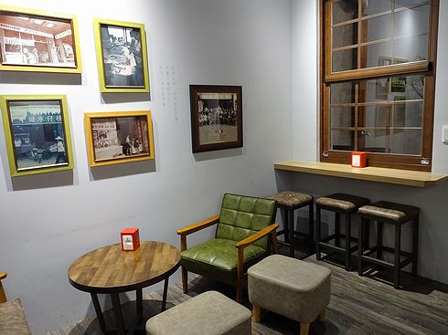 ▲壁には、枝仔冰城の歴史を物語る数々の写真が飾られていす。ソファーなどもシンプルながらアンティークなテイストのものが揃えられていました。