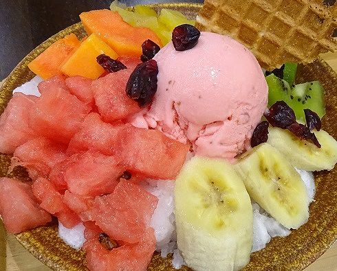 スイカ、マンゴー、パイナップル、キウイ、バナナ、レーズン、そしてストロベリーアイスクリーム!