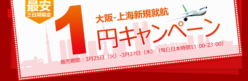 上海浦東国際空港を拠点とするLCC春秋航空が、大阪―上海線の片道1円のセールを行います。 販売期間:2014年3月25日~...